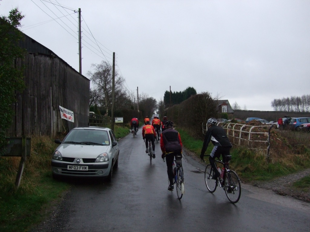 What a ride this turned out to be. Splits all over the place. First stop was at Deeside Industrial estate when David broke his chain. Peter stayed with him as they called in at the Eureka sports shop. The rest of us headed out to the rail bridge and up to Northop Lights. Here the group split with Clive and three others making it through the lights and the rest of us stuck.