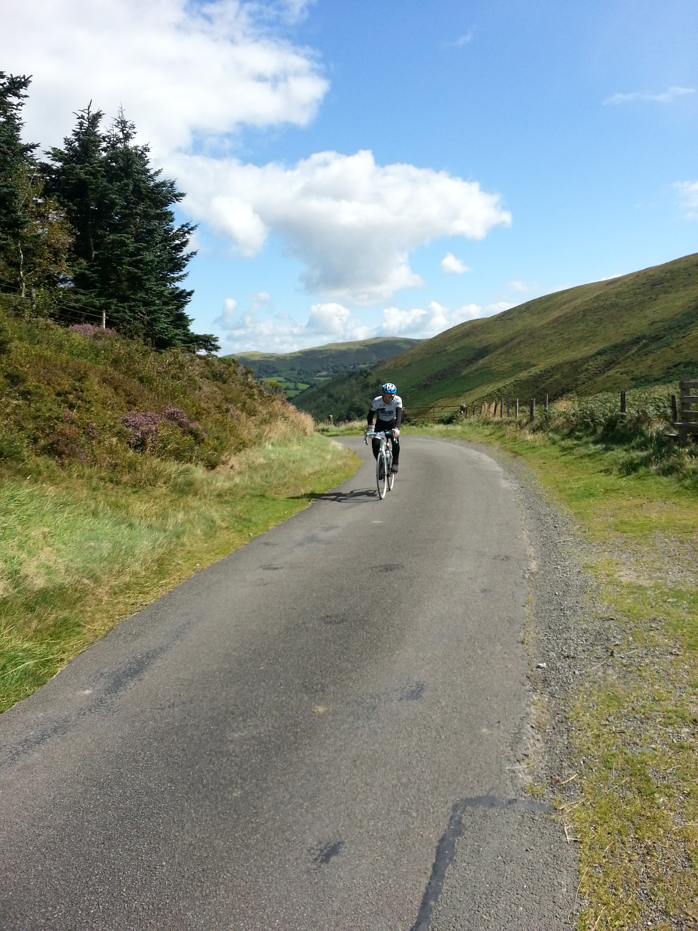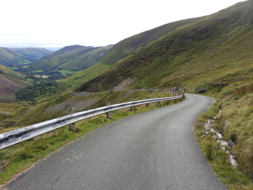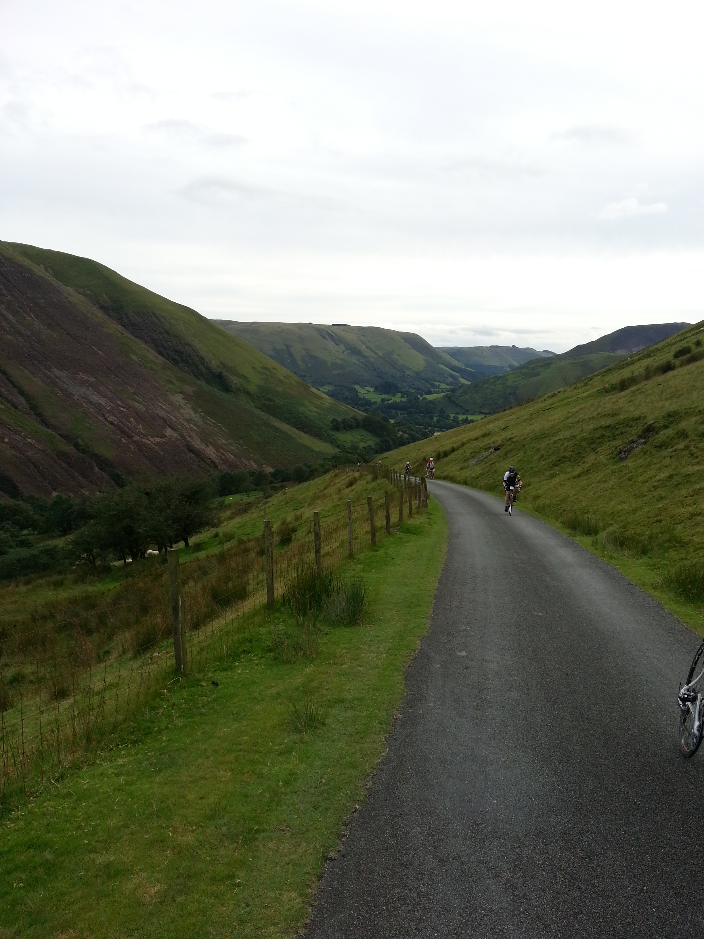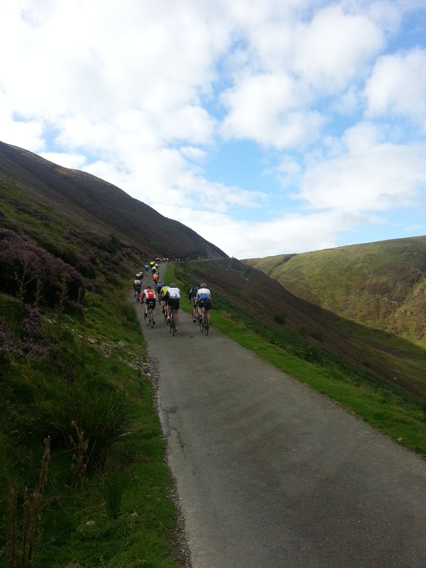 2.5 miles in after tagging on to a club doing 9.5mph across the lake shore we were confronted by the climb of the Hirnant.
