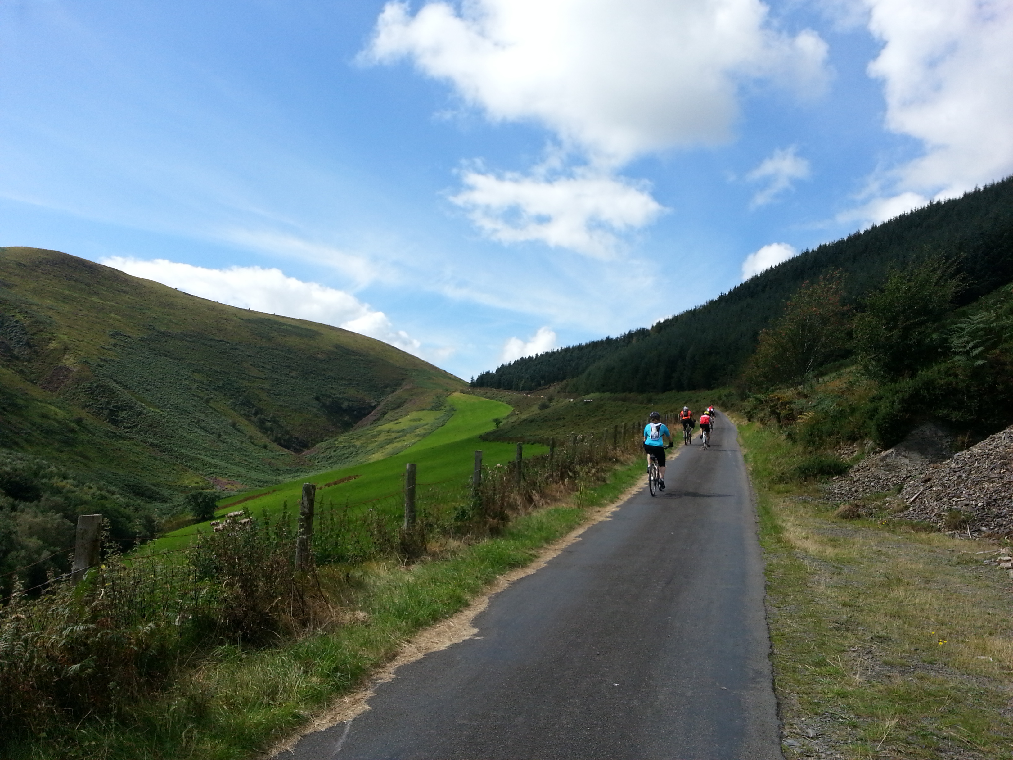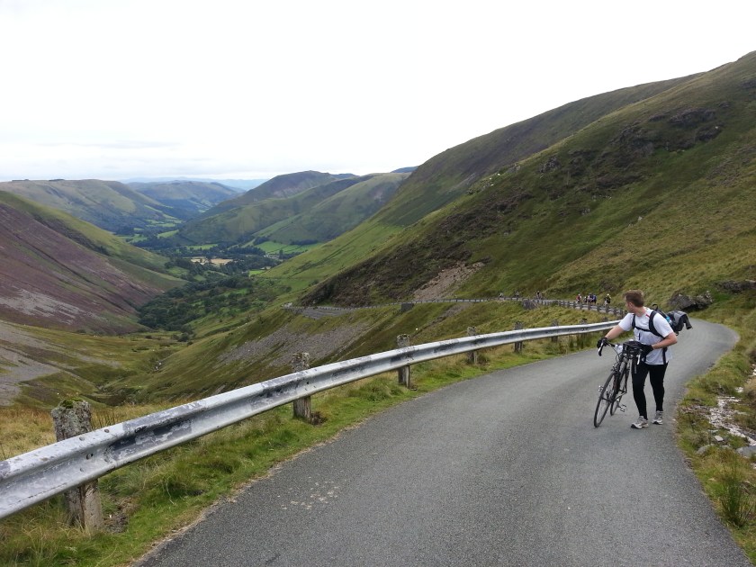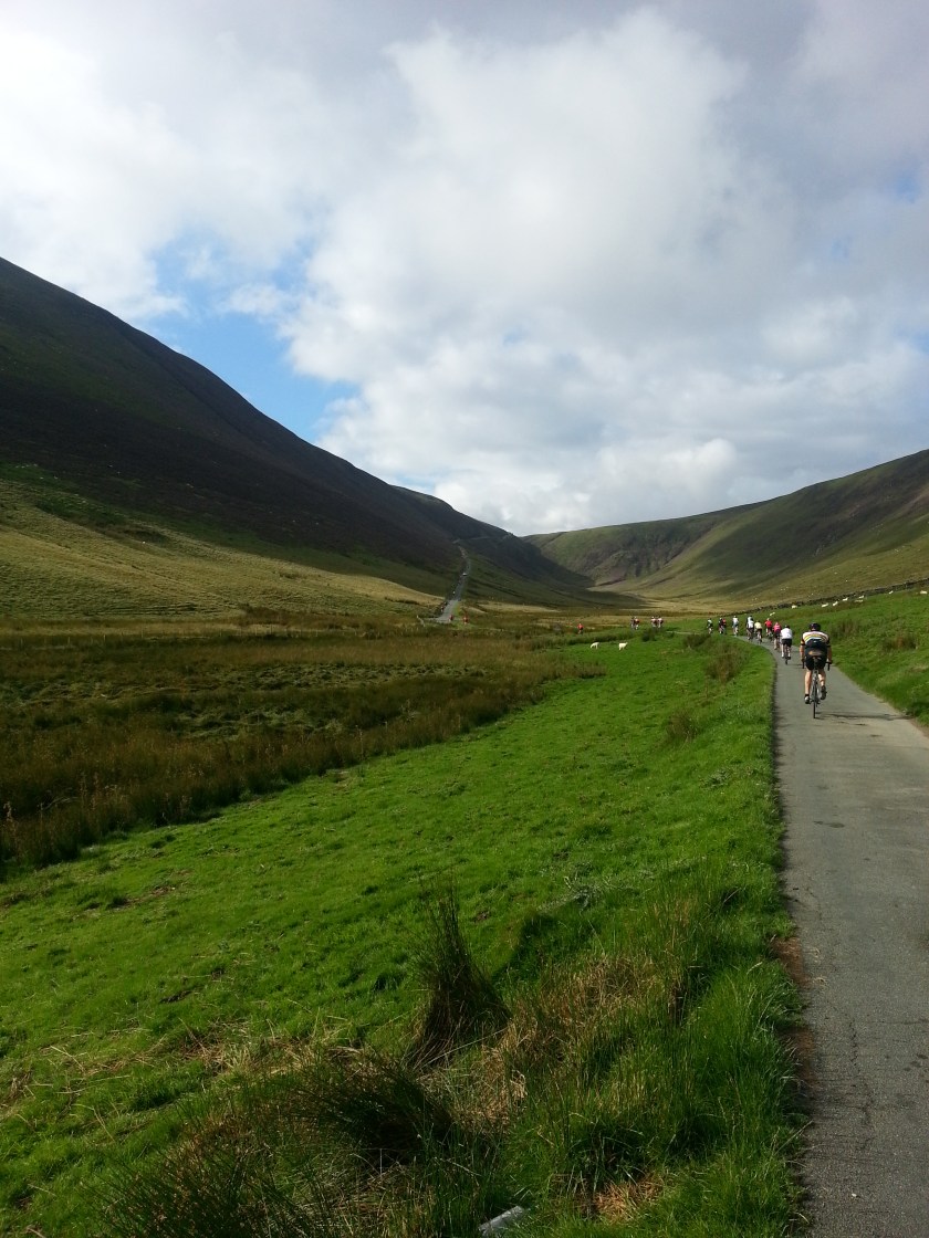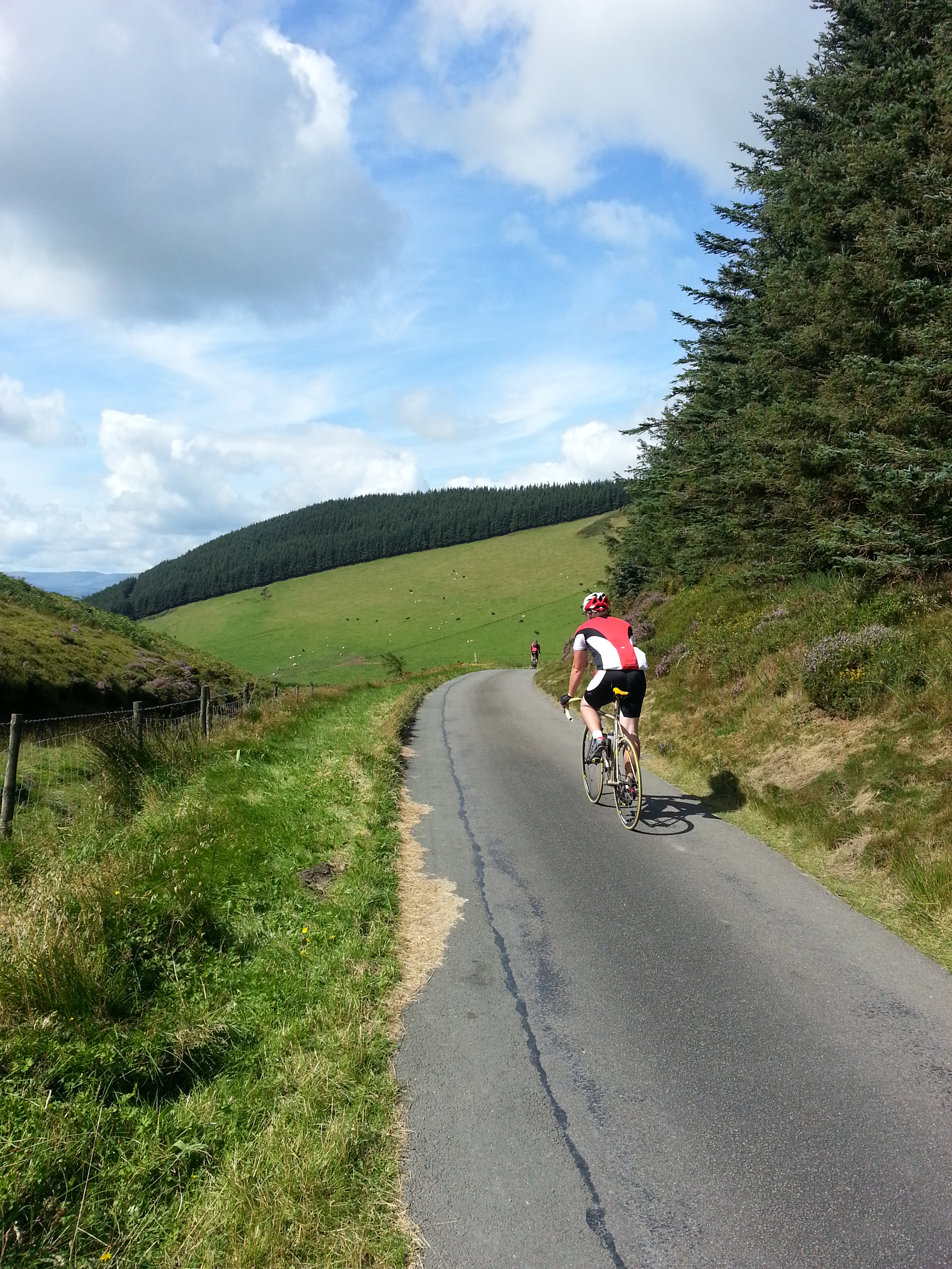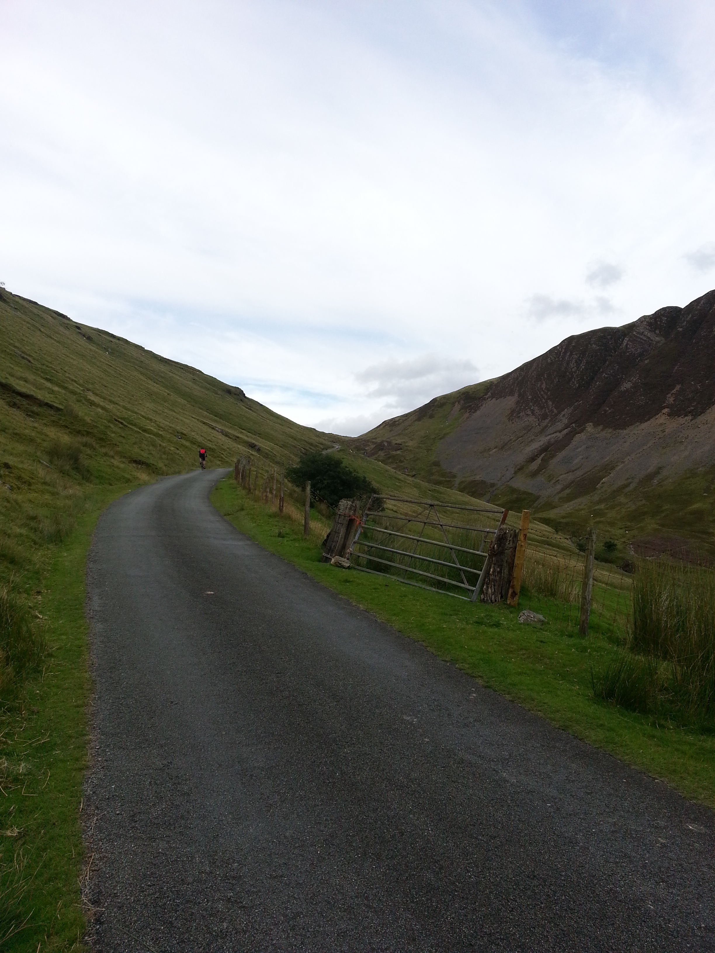 2.5 miles in after tagging on to a club doing 9.5mph across the lake shore we were confronted by the climb of the Hirnant.